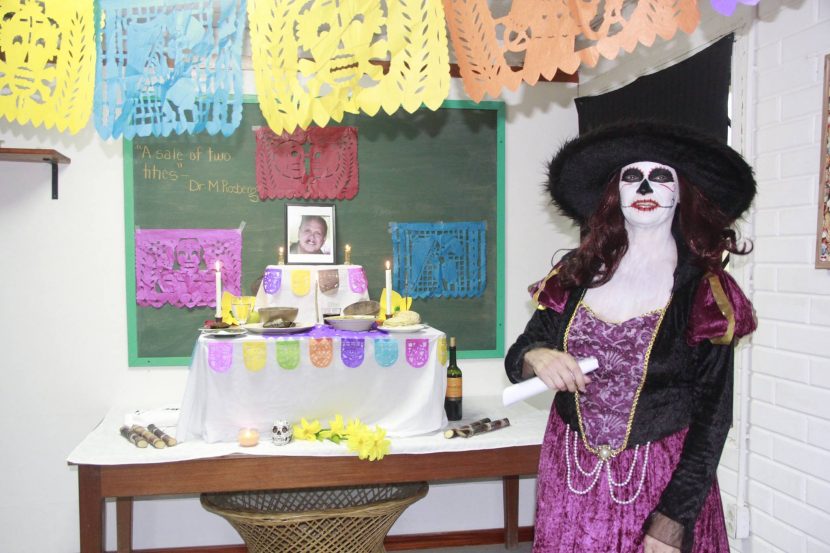 Galen’s Anthropology club has been busy this week. Today they held a traditional activity to observe Dia de los Muertos on campus. The Club dedicated an altar to the memory of fallen Galen professor, Dr. Michael Rosburg. Members of the club also sold I’xpasha (traditional bollos with olives and black beans in the corn) and I’xpelon (traditional porridge made of blue corn). Students also feasted on stewed pumpkin which the club prepared and sold.